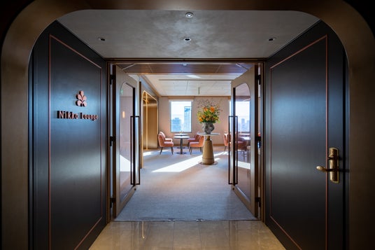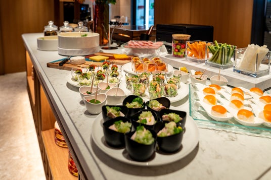 エレベーターホールからは、雲をイメージした絨毯と両サイドを照らすライン照明がラウンジへと誘います。エントランス正面には象徴的なフラワーアレンジメントを、右手にはコンシェルジュデスクを配置。ラウンジエリアには、ベンチシートやソファなど、コーナーごとに趣の異なる座り心地の良い椅子を配しています。さらに、モーニングタイム(ライトミール)、ティータイム、カクテルタイムにフードとドリンクをご提供するブッフェコーナー、グループ利用や会議のご要望に対応する個室を備えています。