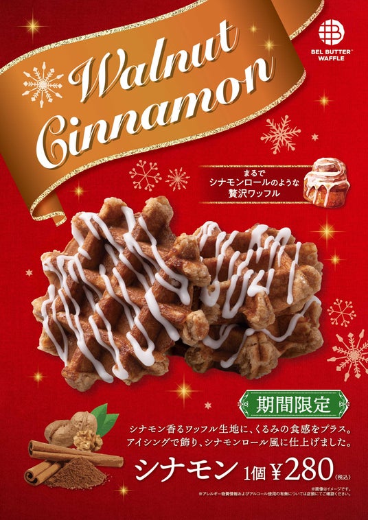 ブランドのこだわりであるベルギー産の"発酵バター"のリッチなリエージュワッフルをベースに、人気の「シナモンロール」の要素を掛け合わせた、この冬だけの特別な味わいです。くるみの食感を加えた、シナモンとバター香るコク深いワッフル生地は、焼き上げることで甘くスパイシーな香りがより一層引き立ちます。仕上げにアイシング(シュガーグレーズ)をデコレーションし、見た目にも可愛らしいシナモンロール風に仕上げました。温かいコーヒーや紅茶とも相性抜群の、この冬限定のワッフルをぜひお楽しみください。