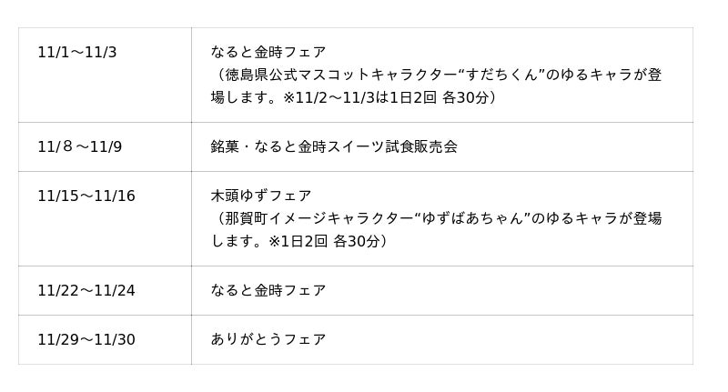 期間中、秋の味覚、徳島特産の「なると金時」 や「木頭ゆず」を使ったスイーツ・グルメを揃え、週末毎にイベントの開催を予定しています。