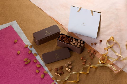 苦味が出ないよう、175℃のオーブンでナッツにじっくりと4割程度火入れしてキャラメリゼした後、銅鍋に溶かしたチョコレートを使ってコーティングを繰り返すこと約6回。当館のパティシエが一粒一粒丁寧に仕上げたショコラが詰まったチョコレート缶は、これまでの概念を打ち破ったひと品。お買い求めは明治記念館内ペストリーショップと、オンラインショップにて。
