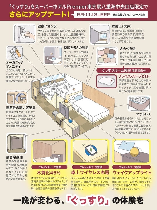 「Natural, Organic, Smart」をコンセプトに国内外177店舗のホテル運営を手掛ける株式会社スーパーホテル(所在地:大阪府大阪市、代表取締役社長:山本健策)は、11月1日(土)からスーパーホテルPremier東京駅八重洲中央口にて、スーパーホテルで初となる「ぐっすり」への取り組みを進化させたコンセプトルームの提供を開始いたします。本コンセプトルームは、『スタンフォード式 最高の睡眠』著者で知られる西野精治教授が最高研究顧問を務める株式会社ブレインスリープ(代表取締役:廣田敦)監修のもと設計されました。