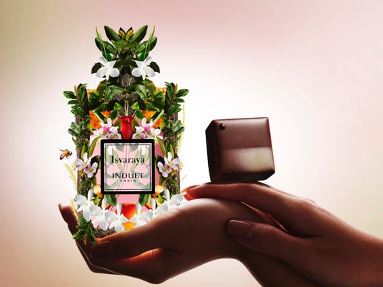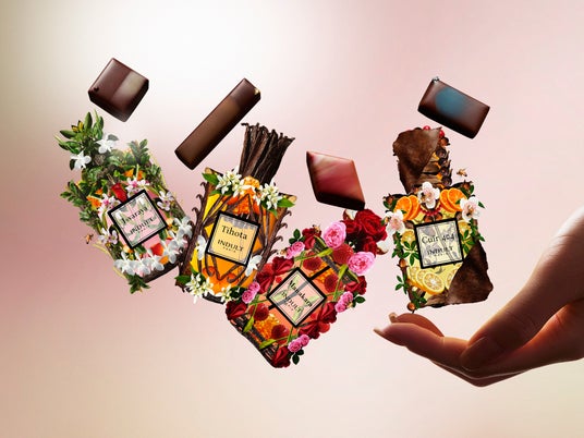 小山氏が魅せられた、INDULT PARIS(インダルト パリ=フランスの香水ブランド)の4つの香り。嗅覚に訴える表層と深層を味覚に映し替え、ボンボンショコラという領域で表現しました。
