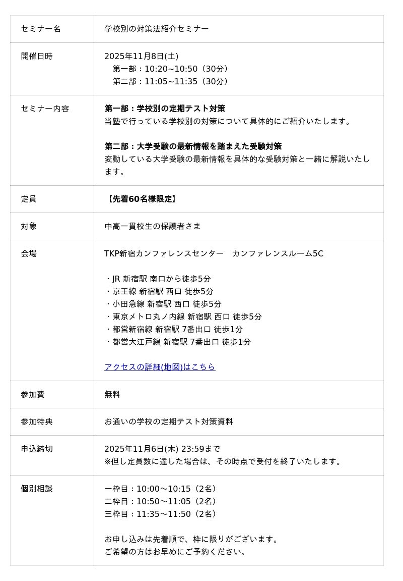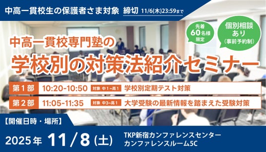 【累計参加者100名超!】中高一貫校生に向けた「学校別の対策法紹介セミナー」を11月8日(土)に新宿で開催。「定期テスト対策」と「受験戦略」を徹底解説!