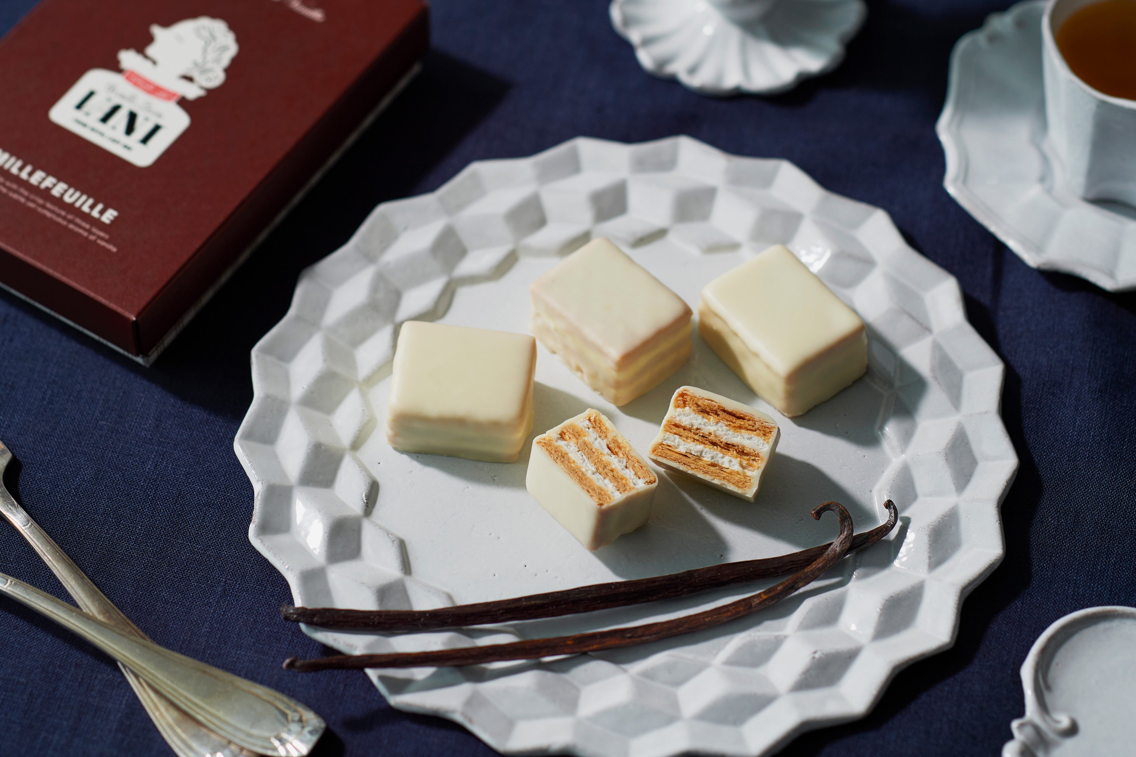 サクサクとしたパイを3枚に重ね、間にはバニラを使用した軽やかなクリームをはさみました。