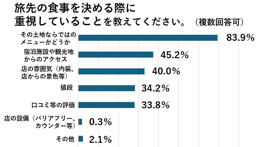 旅先の食事を決める際に重視していることを教えて、という質問に対して、一番多かった回答は、「その土地ならではのメニューかどうか」で83.9%の方が回答。2番目に多かったのが「宿泊施設や観光地からのアクセス」という、時間も限られる旅行においての現実的な回答でした。次いで「店の雰囲気」「値段」「評判」と続き、旅先での「店の設備」についてはあまりこだわらないようです。