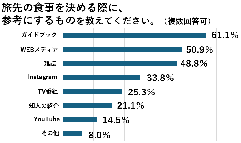 旅先の食事を決める際に参考にするものは?という問いに、61.1%の方が挙げたのが「ガイドブック」。次いで「WEBメディア」で50.9%、「雑誌」は48.8%の方が参考にしていました。「Instagram」や「YouTube」のようなSNSも併用して好みの「食」探しの参考にしていることがうかがえました。その他には「その土地の観光サイト」といった旅慣れた方ならではのコメントもありました。