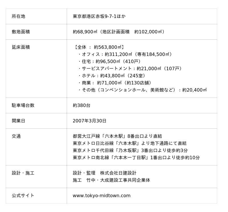 東京ミッドタウンは、かつて防衛庁があった土地にホテル(ザ・リッツ・カールトン東京)、文化施設(サントリー美術館、21_21 DESIGN SIGHTなど)、商業店舗、オフィス、住宅、医療施設、緑地などが集約された大規模複合都市です。