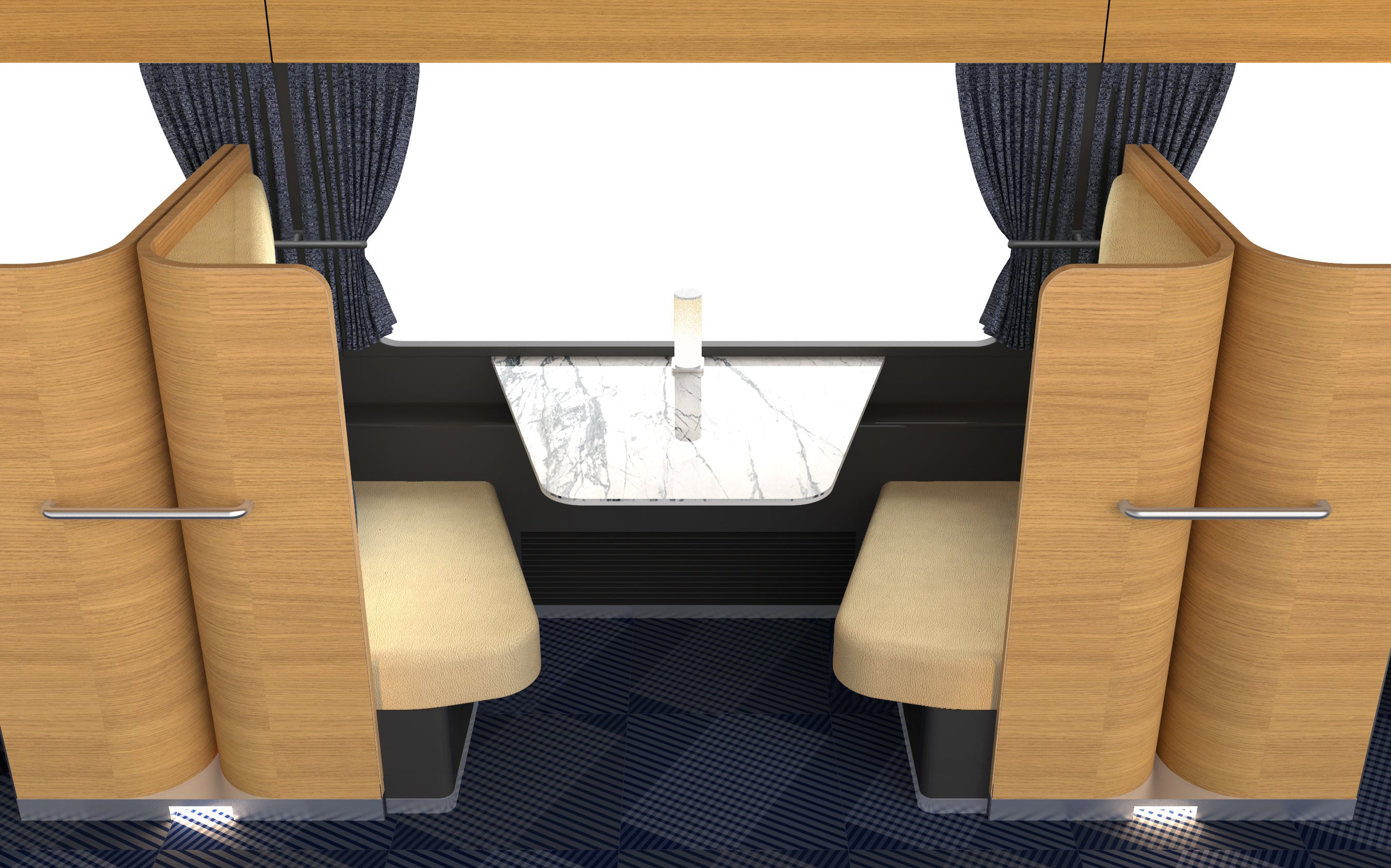 ・フレンチ膳を味わいながら車窓を楽しめるように、窓1つに対して各席を斜め向きに配置します。