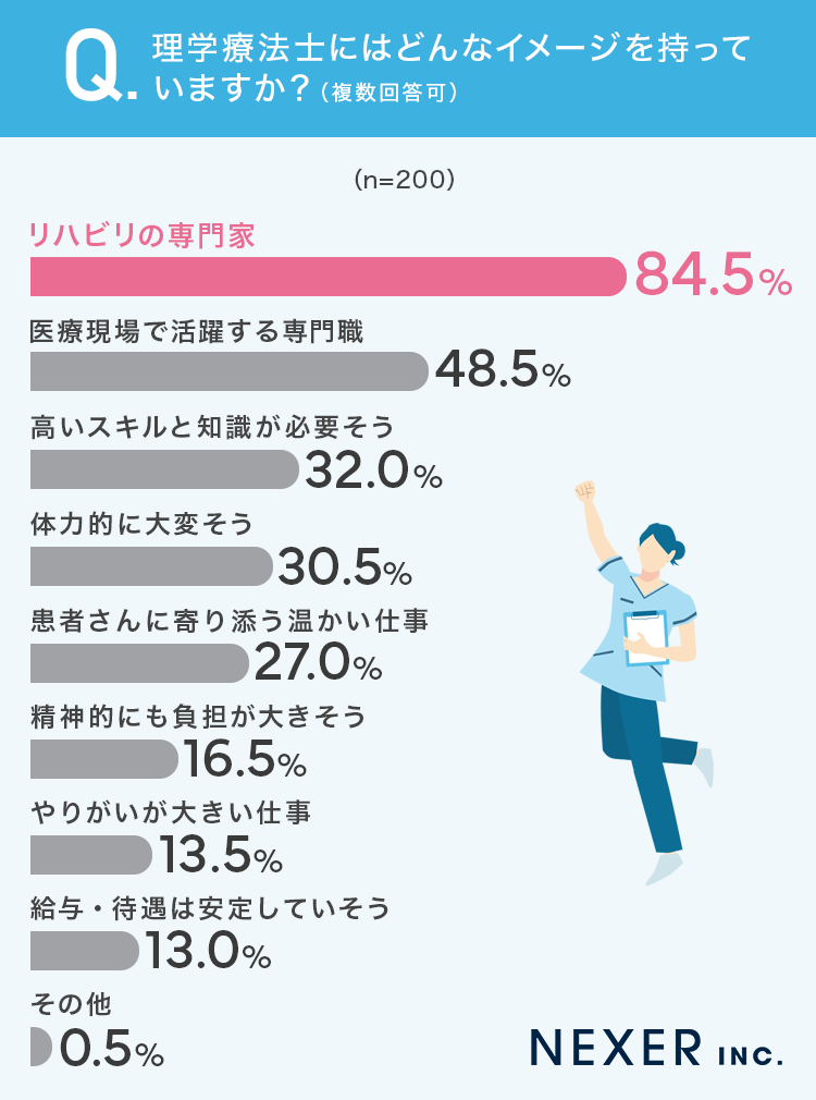 ということで今回は『専門学校医学アカデミー 理学療法学科』と共同で、事前調査で「理学療法士という職業を知っている」と回答した全国の男女200名を対象に「理学療法士のイメージ」についてのアンケートを行いました。