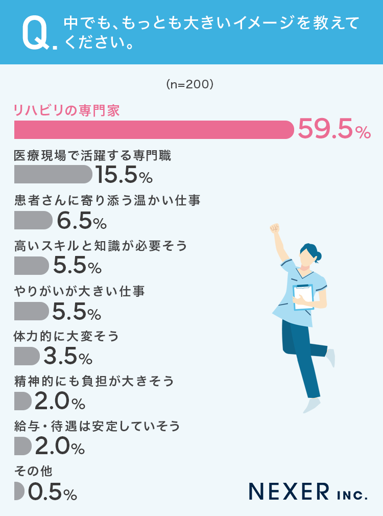 「リハビリの専門家」が59.5%と突出し、2番目の「医療現場で活躍する専門職」15.5%とは大きな差があります。