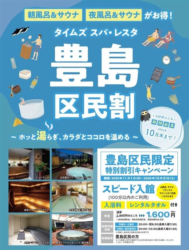 タイムズサービス株式会社(本社:東京都品川区、社長:川崎計介)が運営する「タイムズ スパ・レスタ」(東京都豊島区東池袋、以下レスタ)は、2025年11月1日(土)より「練馬区民割」、「文京区民割」キャンペーンを開始します。