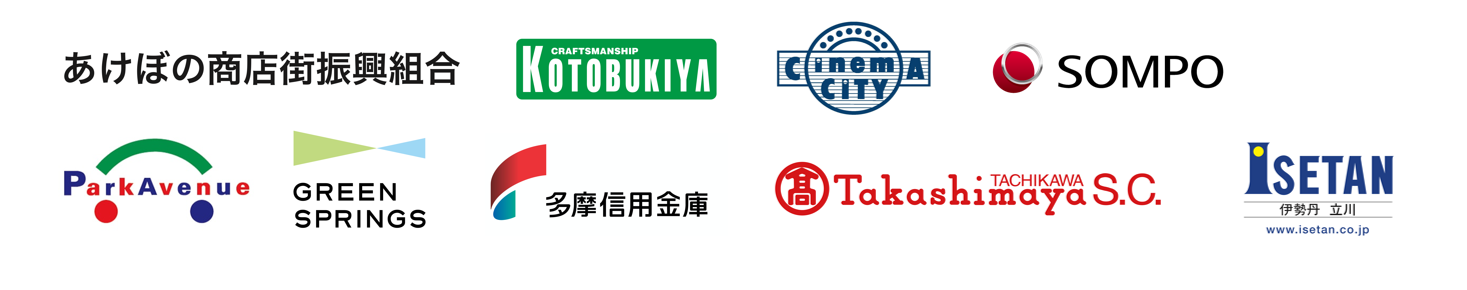 あけぼの商店街振興組合/岩崎商事株式会社/岩崎倉庫株式会社/エミリーフローゲ/大原簿記公務員医療福祉保育専門学校立川校/株式会社きらぼし銀行/株式会社壽屋/株式会社静岡銀行立川ローンセンター/質たからや立川北口店/西武信用金庫/大和証券株式会社 立川支店/立川アスティックFC/立川ダイス/株式会社立飛ホールディングス/多摩信用金庫/多摩都市モノレール株式会社/株式会社テイルウィンドシステム/東京立川歯科衛生学院専門学校/東京立川情報ITクリエイター専門学校/野村證券株式会社立川支店/ファーレ協議会/MAO RINK TACHIKAWA TACHIHI/株式会社みずほ銀行/みずほ証券株式会社/三井住友信託銀行株式会社/三菱UFJモルガン・スタンレー証券株式会社/やまなし地域デザイン株式会社/株式会社山梨中央銀行立川支店/りそな銀行立川支店