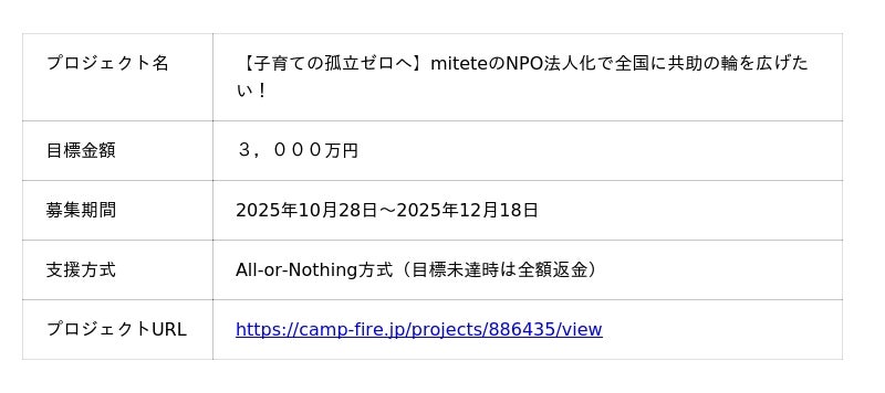 日本初の一時保育マッチングサービス「mitete」を運営する株式会社Connect(本社:東京都新宿区、代表取締役:峰 佳久)は、保護者が安心して支援につながれる社会の実現を目指し、mitete事業のNPO法人化に向けたクラウドファンディングをCAMPFIREにて開始しました。