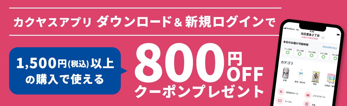 実施期間中にカクヤスネットショッピングの公式アプリをダウンロードして、初回ログインをした方全員にカクヤスネットショッピングの公式ECまたはアプリで1,500円以上の購入で使えるお得な800円オフクーポンをプレゼント!