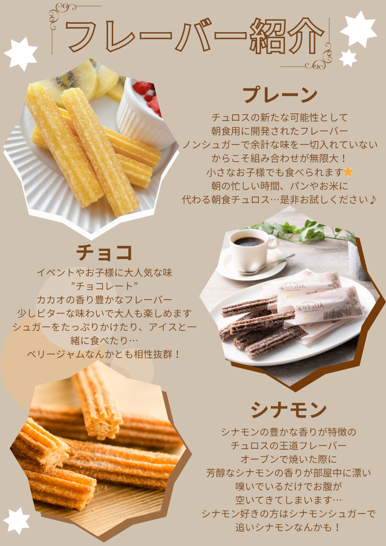 - プレーン朝食用に開発されたシンプルなチュロス。ノンシュガーなので甘さを自分で調整でき、様々なものに合います♪