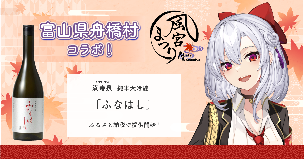 日本酒が大好きなVtuber「風宮まつり」と老舗の酒蔵である満寿泉がコラボをして富山県舟橋村のふるさと納税の返礼品として日本酒「ふなはし」を11月1日(土)17時より提供します。返礼品は株式会社あるやうむ(本社:北海道札幌市、代表取締役:畠中博晶、以下「あるやうむ」)が提供する寄付サイトにて寄付を受け付けます。