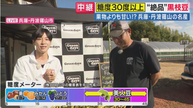 兵庫県丹波篠山市のGREENDAYS FARM(代表:上本浩之)が手がけるブランド黒枝豆「美人豆」が、先日(2025年10月30日放送)の関西テレビ『旬感LIVE とれたてっ!』の生中継にて紹介されました。平均糖度30度以上、最大45度にも達するその驚異的な甘さが「果物よりも甘い」と注目を集めています。