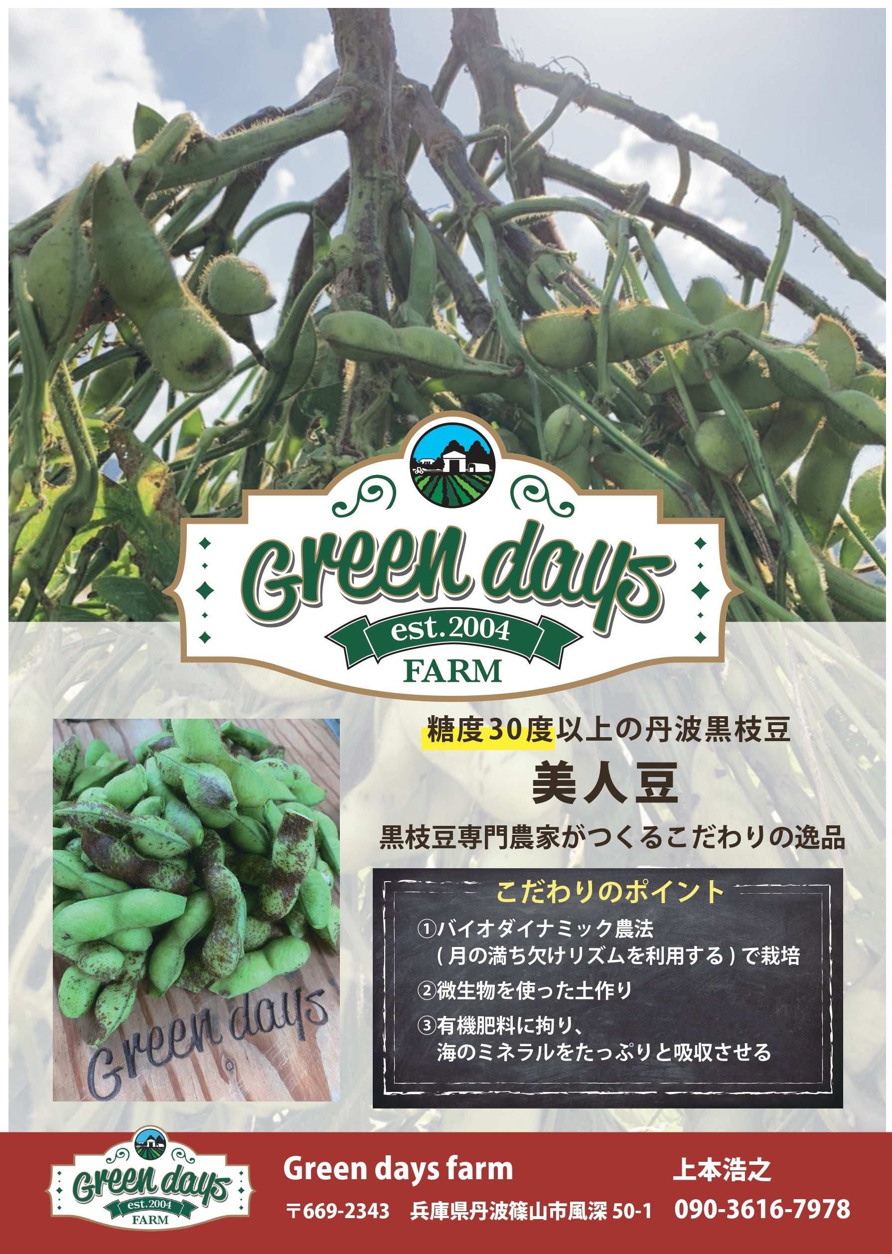 兵庫県丹波篠山市にて「GREENDAYS FARM」を営む上本浩之は、10年以上の歳月をかけて開発したブランド黒枝豆「美人豆」の出荷を、本日2025年11月1日(土)より本格的に開始いたしました