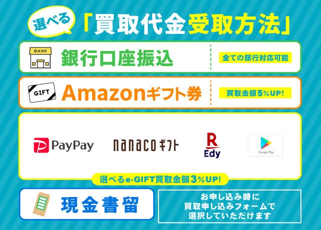 ●買取代金の受け取り方法を、銀行振り込みだけでなく、Amazonギフト券、PayPay、nanaco、楽天Edy、Google Play ギフトコード、レコチョク、現金書留など、多数ご用意