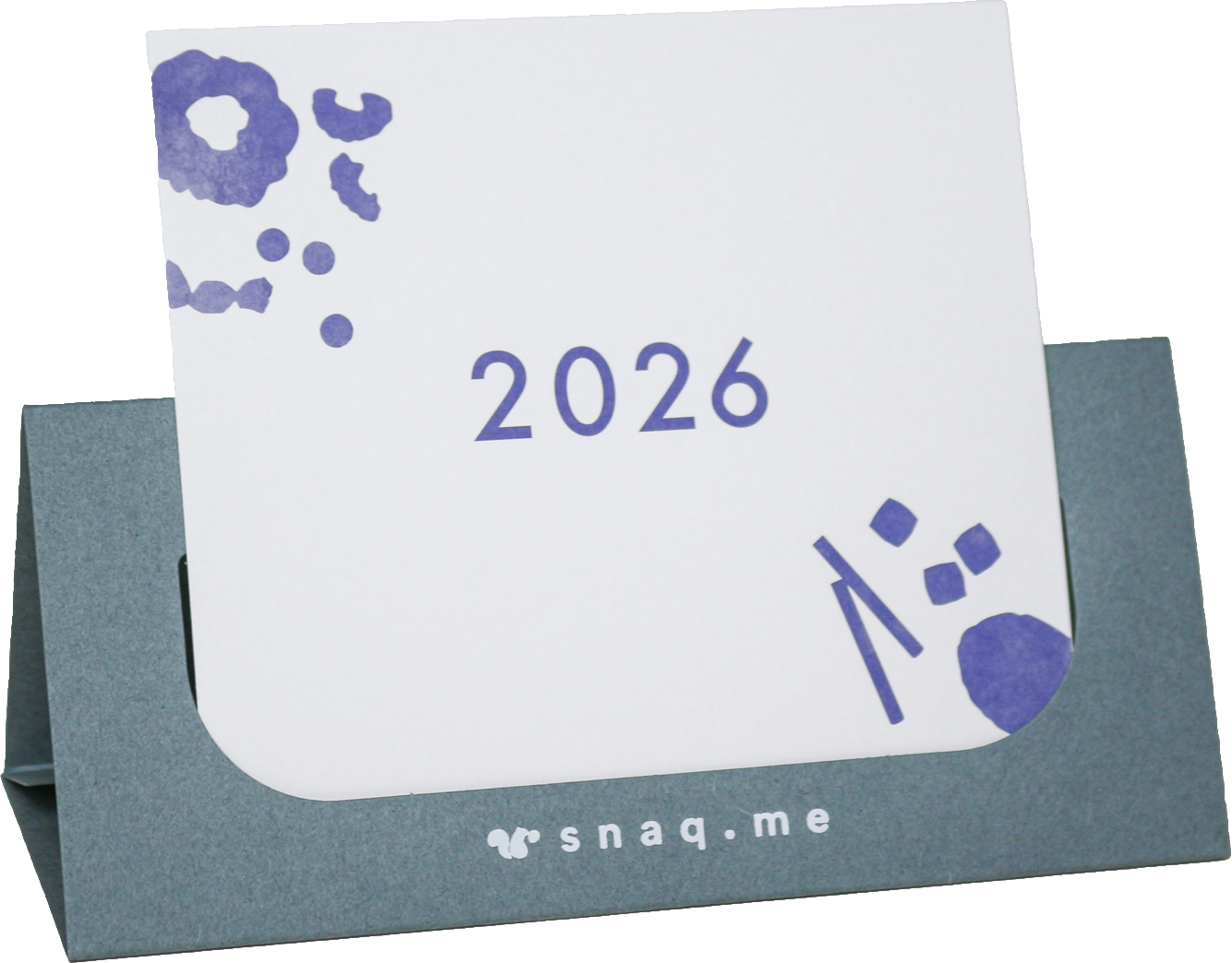 毎年人気のスナックミーオリジナルデザインのカレンダーが今年も登場しました。2026年版は、やさしいブルーグレーの台紙に、月ごとに変わるおやつのイラストを添えた、暮らしになじむデザインです。デスクにも棚にもそっと置けるサイズ感で、次の月を横に並べて見られるカード型を採用しています。毎月めくるたび、ちいさな楽しみが増えていくような気持ちになっていただけるようにデザインしたカレンダーです。