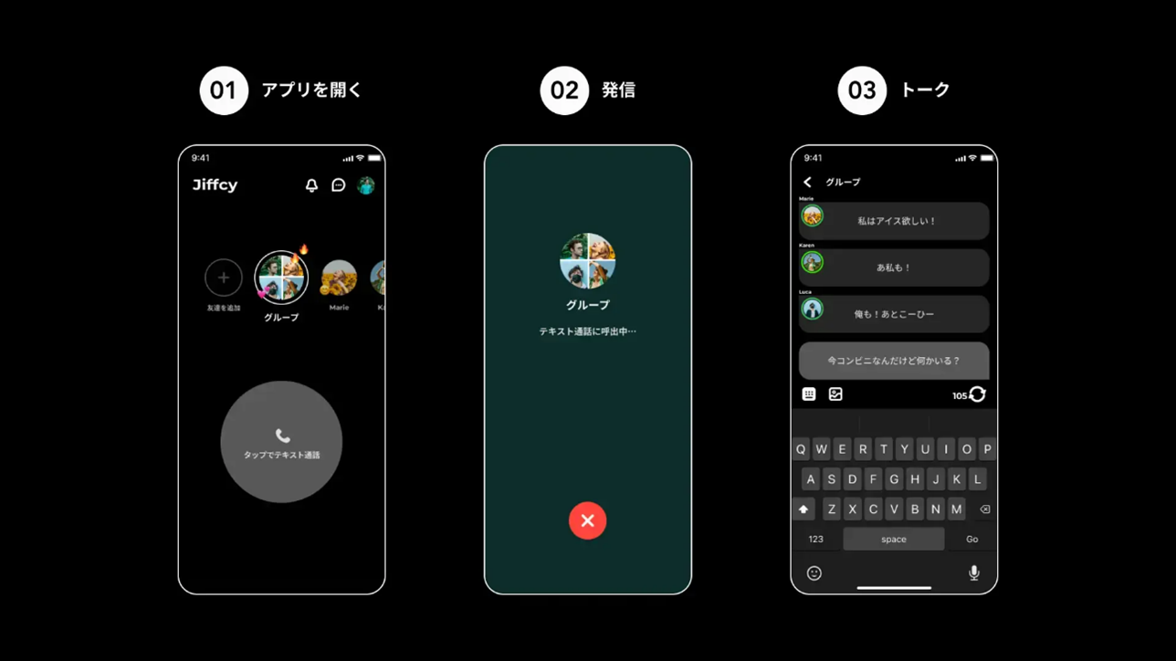 ■テキスト通話アプリ『Jiffcy』とは『Jiffcy』はテキストで通話感覚のコミュニケーションができる、便利で新しいテキスト通話アプリです。『Jiffcy』はリアルの友達、家族、恋人と利用する実名SNSです。電話のように相手を呼び出して、相手が応じると入力した文字が1文字ずつ変換前から表示されるリアルタイムトーク(特許取得済)をすることができます。電話している感覚で声を出さずにコミュニケーションをすることができます。