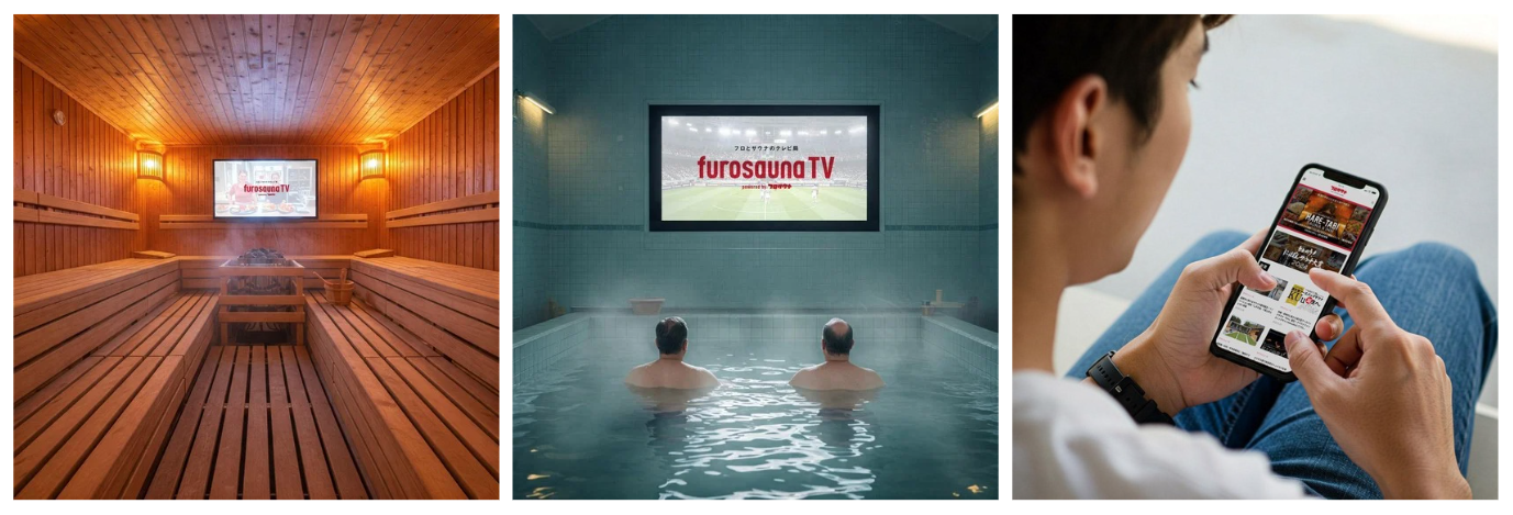 「フロサウナTV」は、温浴施設やサウナ室に設置したデジタルサイネージを通じて、サウナ利用者に向けたオリジナルコンテンツを配信する新しいメディアです。深いリラックス状態にある利用者に、強く印象に残る情報や広告を届けることで、新たな体験価値と広告効果を創出します。 また、サウナ時間の充実、高い広告効果、サウナ業界の活性化、そしてサウナ利用者という特定のターゲットに絞った効果的な広告展開が期待できます。