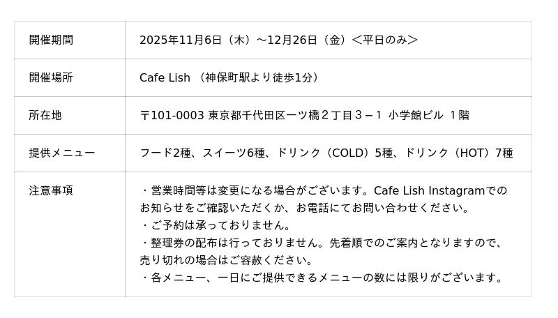 11月6日(木)から12月26日(金)までの期間限定で、小学館ビル1階の「Cafe Lish(カフェ リッシュ)」にてコラボレーション企画を実施いたします。