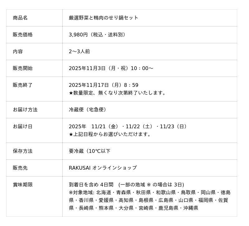 楽彩株式会社(本社:東京都足立区/代表取締役社長:大崎善保)は、11月7日の「鍋の日」に合わせ、昨年も大好評をいただいた『厳選野菜と鴨肉のせり鍋セット』を、2025年11月3日(月)10:00より公式オンラインショップにて200セット限定で販売開始いたしました。