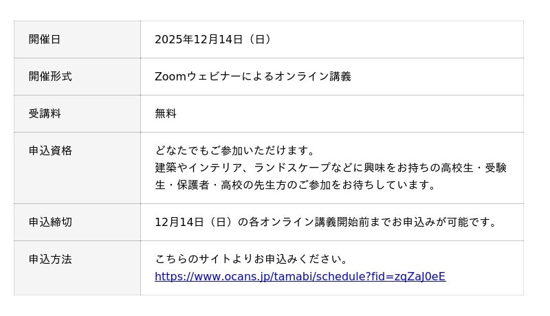 建築・インテリア・ランドスケープなどの分野に興味を持つ高校生、受験生、保護者、高校の先生など、どなたでもご参加いただけます。