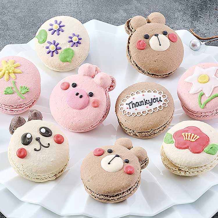 厳選した卵と素材を使い、外はサクッと、中はしっとりと焼き上げたマカロンです。一つひとつ手描きした絵柄に心温まります。