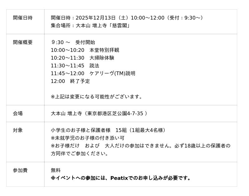 ■ケアリーヴpresents「心を磨く!親子で年末大掃除体験in増上寺」 開催概要