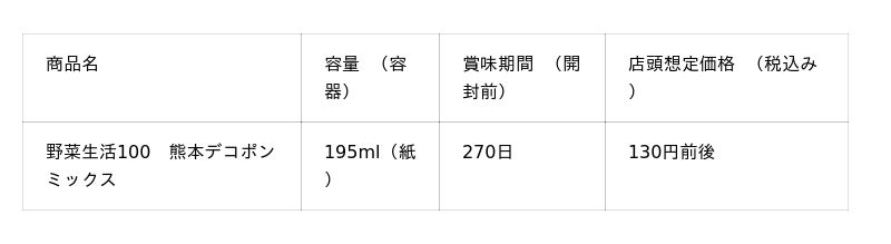 このたび発売する「野菜生活100 熊本デコポンミックス」は、20種の野菜と4種の果実を使用し、上品な甘さが特徴の熊本県産デコポンの味わいの野菜・果実100%ミックスジュースです。砂糖不使用で、1日分※1のビタミンCを摂ることができます。朝食のおともや、リフレッシュしたいときにおすすめです。