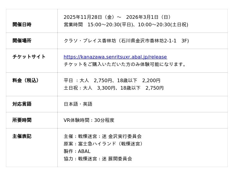 株式会社ABAL(東京都目黒区 代表取締役・CEO 尾小山良哉)は、株式会社電通(東京都港区 代表取締役 執行役員 佐野傑)と株式会社テレビ金沢(石川県金沢市 代表取締役社長 原田康久)と共に、11月28日(金)からクラソ・プレイス香林坊(石川県金沢市香林坊2-1-1)3Fで、XR(拡張現実)技術を用いたVRホラーアトラクション『戦慄迷宮:迷』を開催いたします。