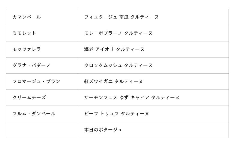 使用するチーズは、カマンベール、ミモレット、モッツァレラ、グラナ・パダーノ、フロマージュ・ブラン、クリームチーズ、フルム・ダンベールの7種類。