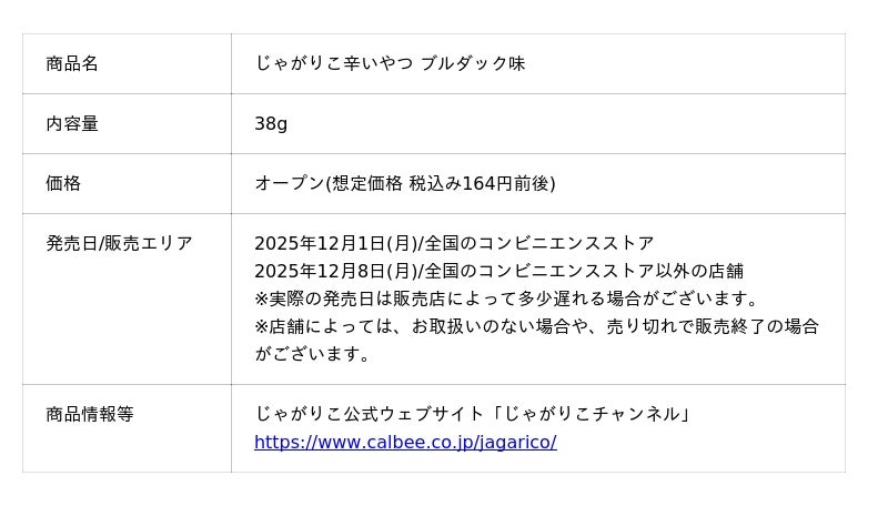 カルビー株式会社(本社:東京都千代田区、代表取締役社長兼CEO:江原 信)は、独自の製法で"はじめカリッとあとからサクサク"の心地よい食感が楽しめる「じゃがりこ」ブランドから、株式会社三養ジャパンのもと「ブルダック炒め麺」の味を再現した『じゃがりこ辛いやつ ブルダック味』を2025年12月1日(月)から全国のコンビニエンスストアで数量限定発売します。コンビニエンスストア以外の店舗では2025年12月8日(月)から数量限定発売します(なくなり次第、終了)。