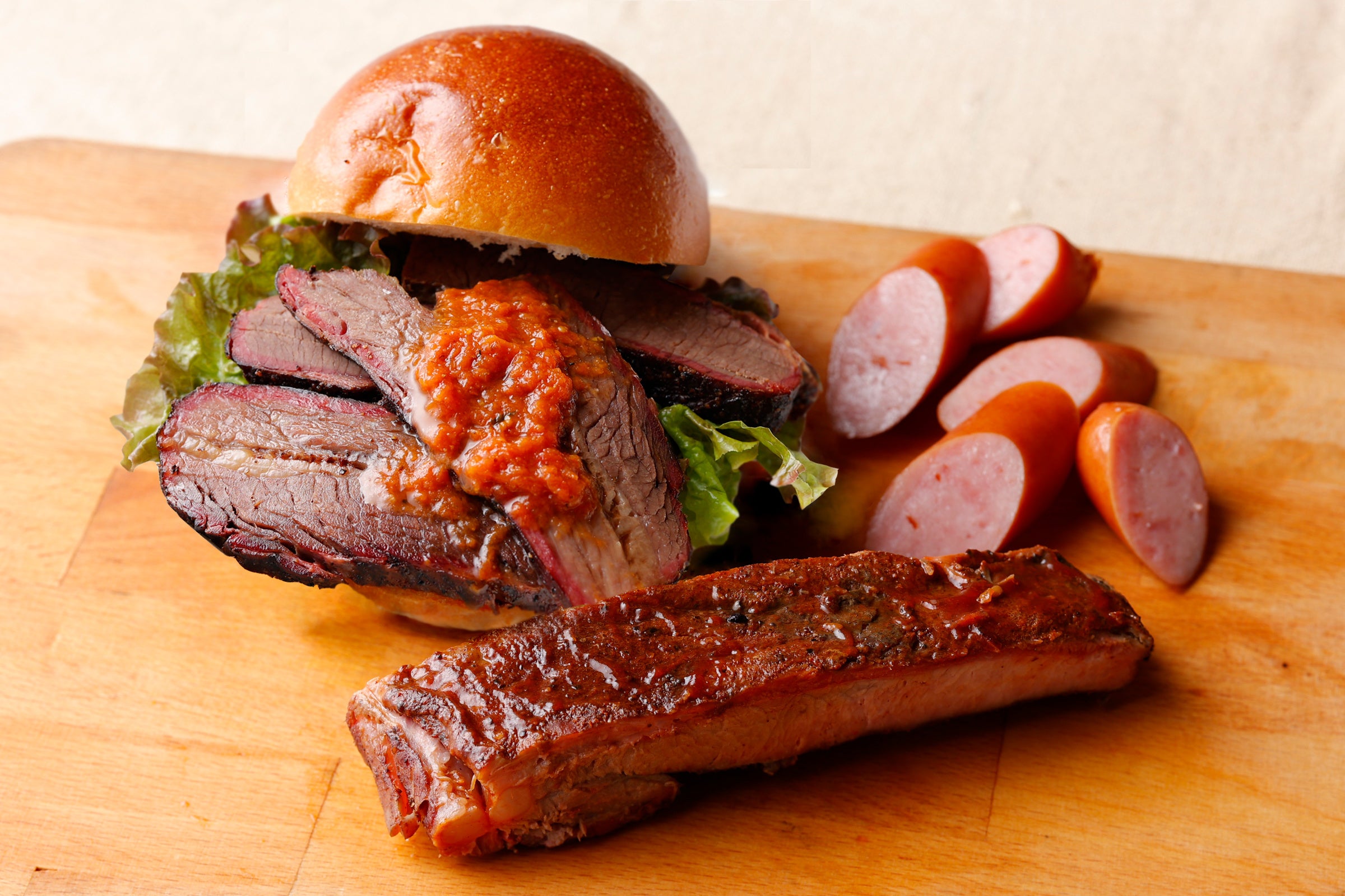 サンドには、テキサススタイルのオフセットスモーカーで12時間かけてスモークしたブリスケットが独自のスタイルを織りなす。
