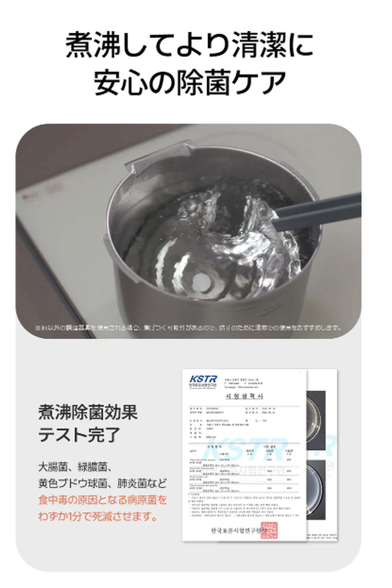 この"煮沸加熱除菌"により、大腸菌や黄色ブドウ球菌、肺炎菌など、空気中に拡散する恐れのある雑菌をわずか1分で99.9%除去可能と確認しました。