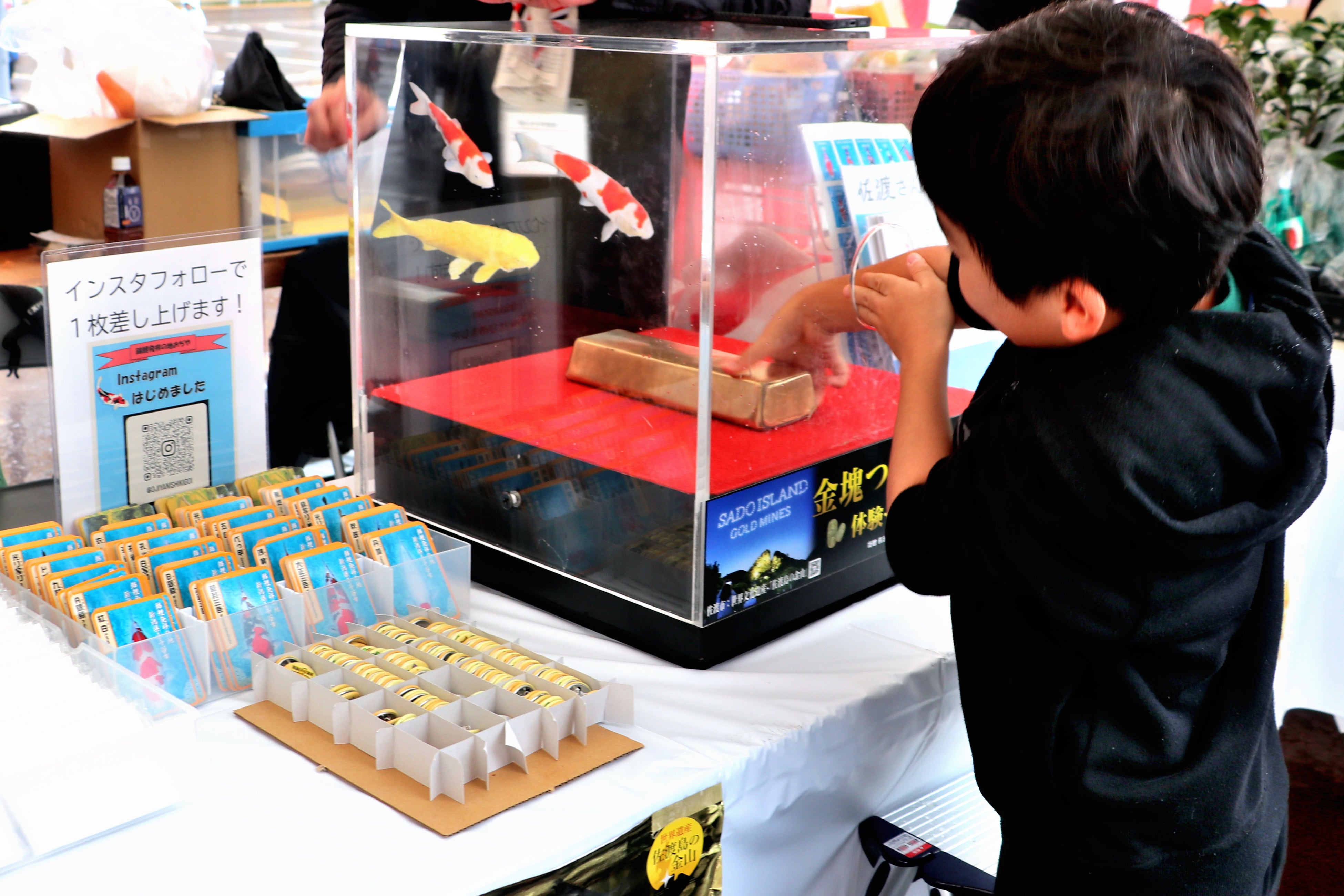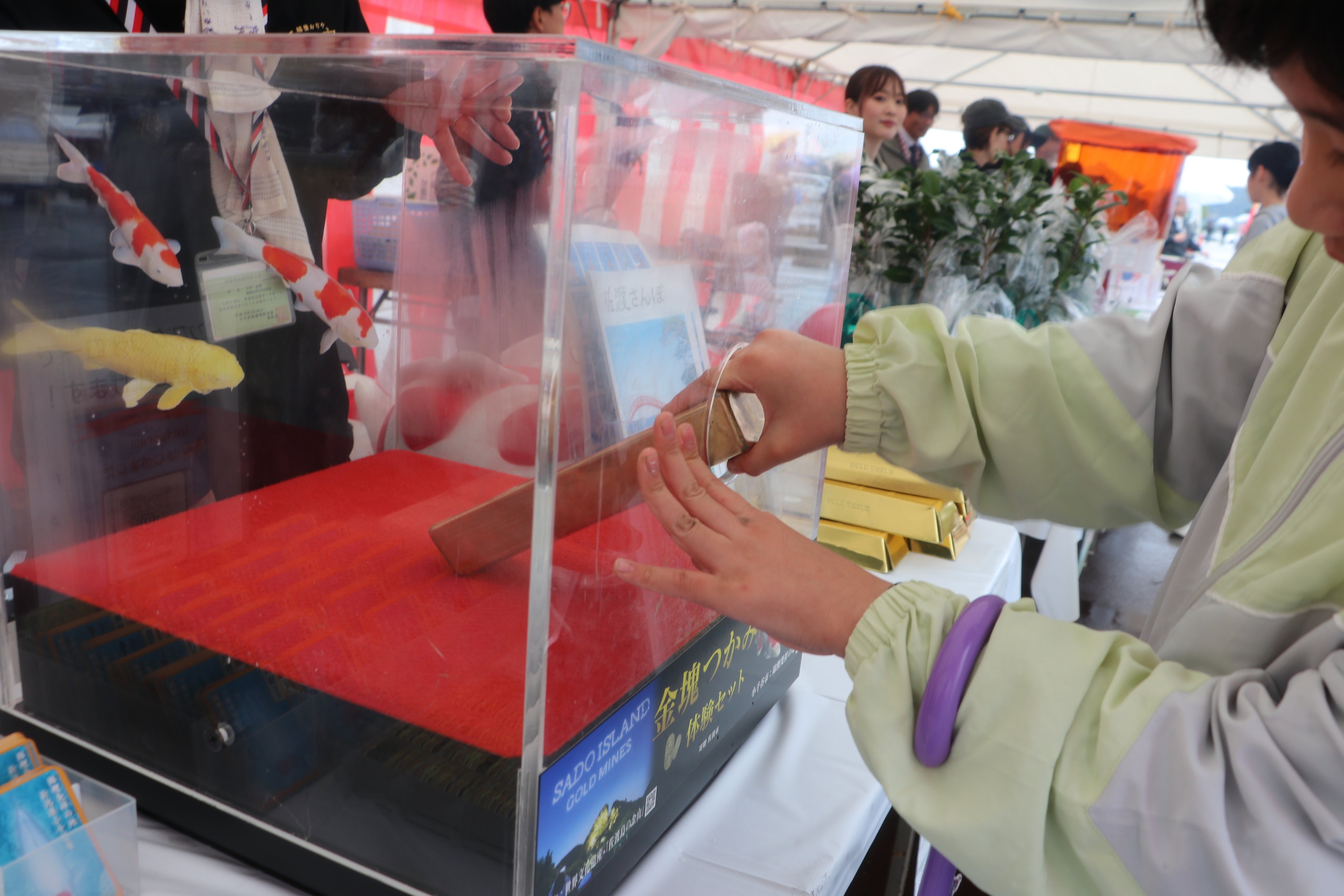 令和6年7月の「佐渡島の金山」世界文化遺産登録を記念して小千谷市から錦鯉を寄贈したお礼に贈呈されたもので、ケースの中にある7.5キログラムの金塊のレプリカを取り出して、金の重さを体験できます。
