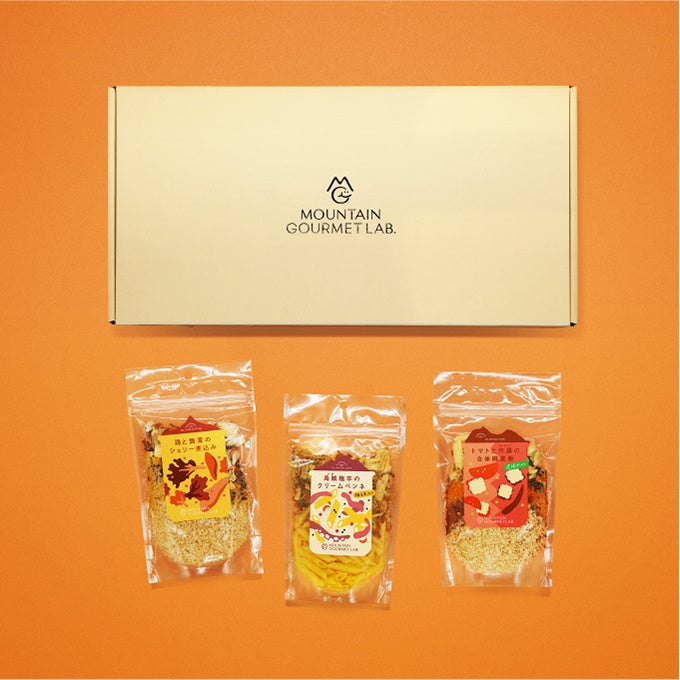 「MOUNTAIN GOURMET LAB.(マウンテン グルメ ラボ)」ギフトセット -スタッフおすすめ 6,280円(鶏と舞茸のシェリー煮込み・烏賊塩辛のクリームペンネ・トマトと炸醤の合体麻婆飯(厚揚げ入り)※一例)長期保存可能なレストランクオリティーのドライフード。