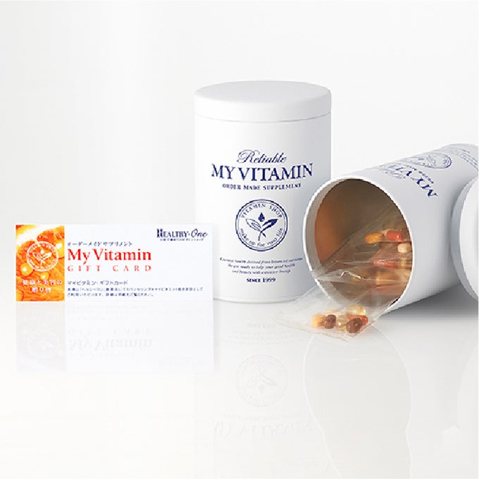「HEALTHY-One(ヘルシー ワン)」マイビタミンギフト缶+マイビタミンギフトカード(1~3枚)5,400円~16,200円 ギフトカードを店頭にお持ちいただくと、栄養士スタッフがお客様の食生活や生活スタイル、お悩みに合わせてサプリメントをご提案。