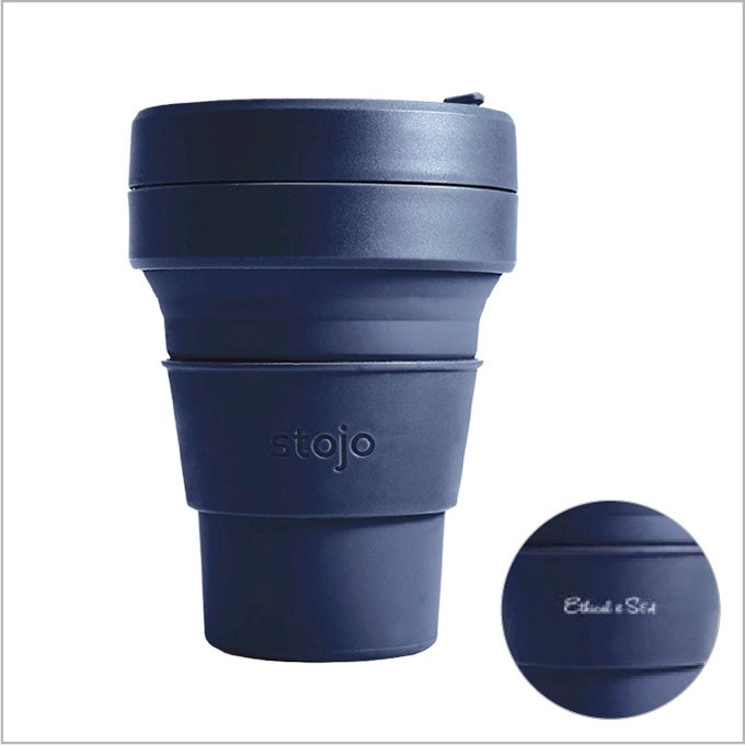 「Ethical&SEA(エシカル&シー)」stojo STOJO-POCKET CUP DENIM 1,800円 飲んだ後にクシャッと折り畳んで、バッグにしまって持ち運べます。割れる心配がなく、ホットとアイスどちらも対応。