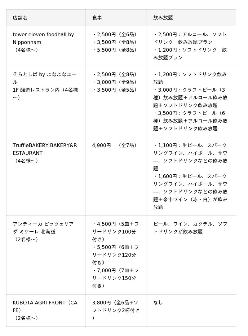 北海道ボールパークFビレッジ内のレストラン「tower eleven foodhall by Nipponham」「そらとしば by よなよなエール」「TruffleBAKERY BAKERY&RESTAURANT」「アンティーカ ピッツェリア ダ ミケーレ 北海道」「KUBOTA AGRI FRONT(CAFE)」では、団体様向けパーティープランの予約を開始いたします。