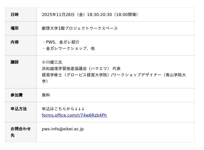叡啓大学(学長:有信睦弘、広島市中区)は、2025年11月28日(金)、叡啓大学のプロジェクトワークスペースにて、PWS月次イベント「~『わかりあえなさ』の正体を解き明かす!対話ワークショップ【出張金ガレin広島】~」を開催します。