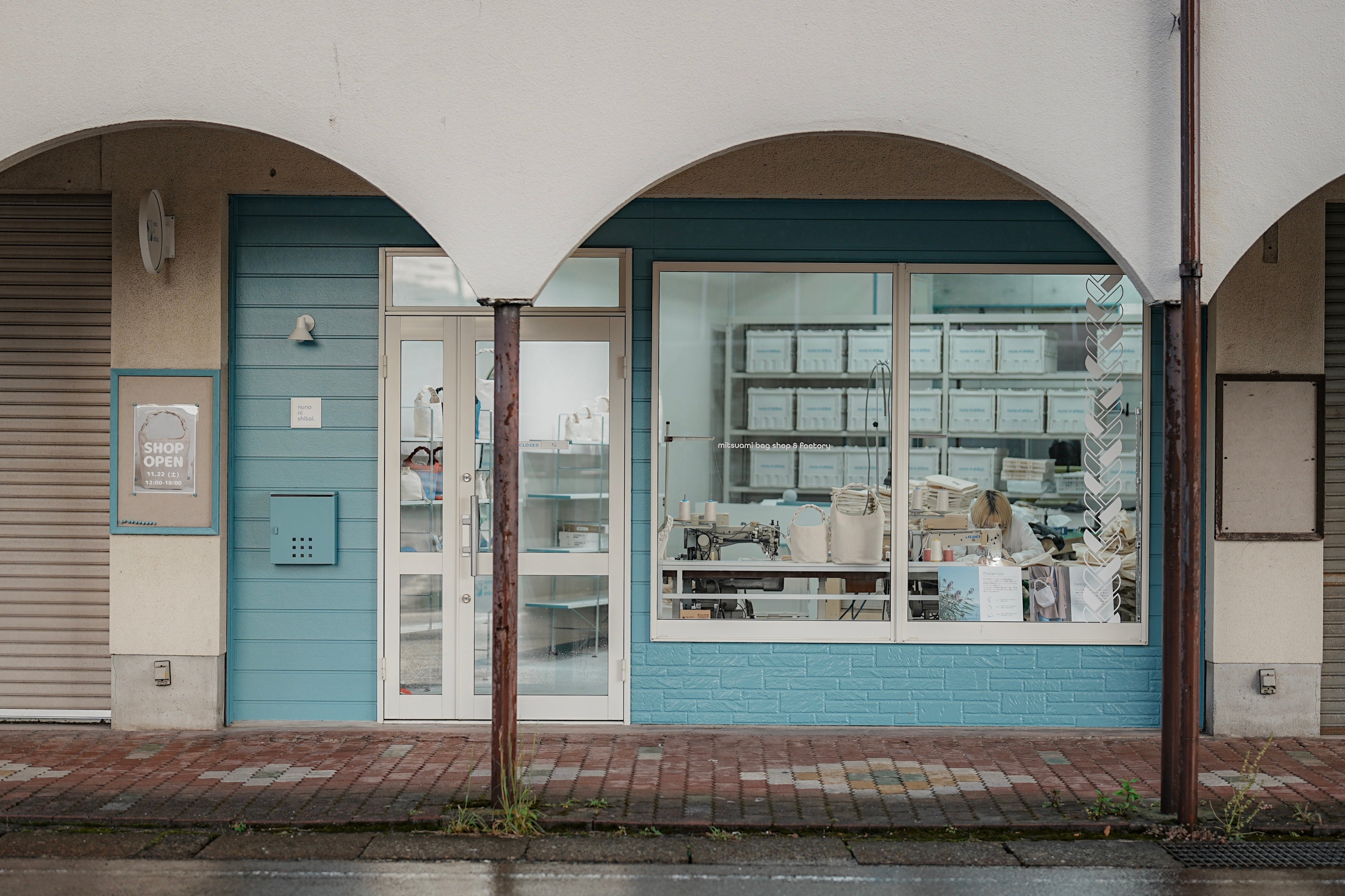 JR湖西線 近江今津駅からローラン名小路商店街を抜けた直ぐのアクセスしやすい場所です。大きなガラス窓で、通りからも店内がみえます。実店舗がなかったことから「実物を見たい」という声にお応えし、店舗スペースをつくりました。通りからはミシンを踏む制作の様子も見ることができます。 シャッターが目立つ駅前の商店街に往来がうまれることで、少しでも地域が元気になれば、と考えています。