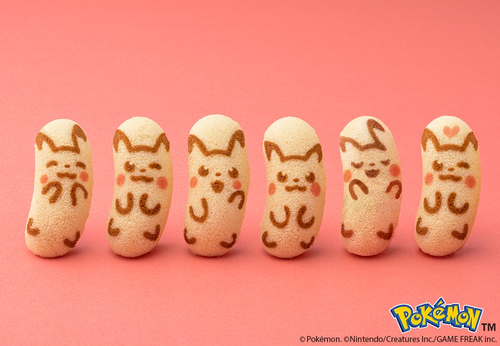 スポンジケーキの模様は6種類。注目はハート模様がついたごきげんな"ハート付きピカチュウ"。ときどきしか出現しないので、出会えたらいいことあるかも…!モンスターボールをイメージしたデザインの袋にひとつひとつはいっています。どの模様が出てくるかお楽しみに。