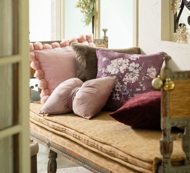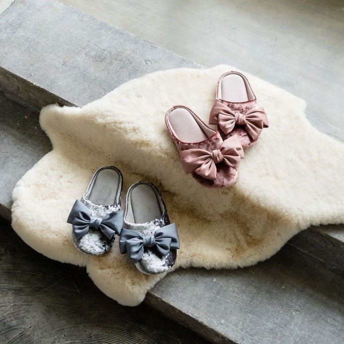 花柄クッションに寄り添い、心ほどけるひととき。光沢リボンのスリッパで、足元まで華やかに。