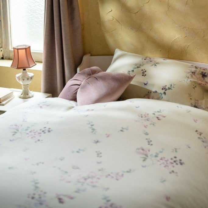 やさしい花柄の布団に包まれてお気に入りの小物に囲まれる、冬のくつろぎ時間。
