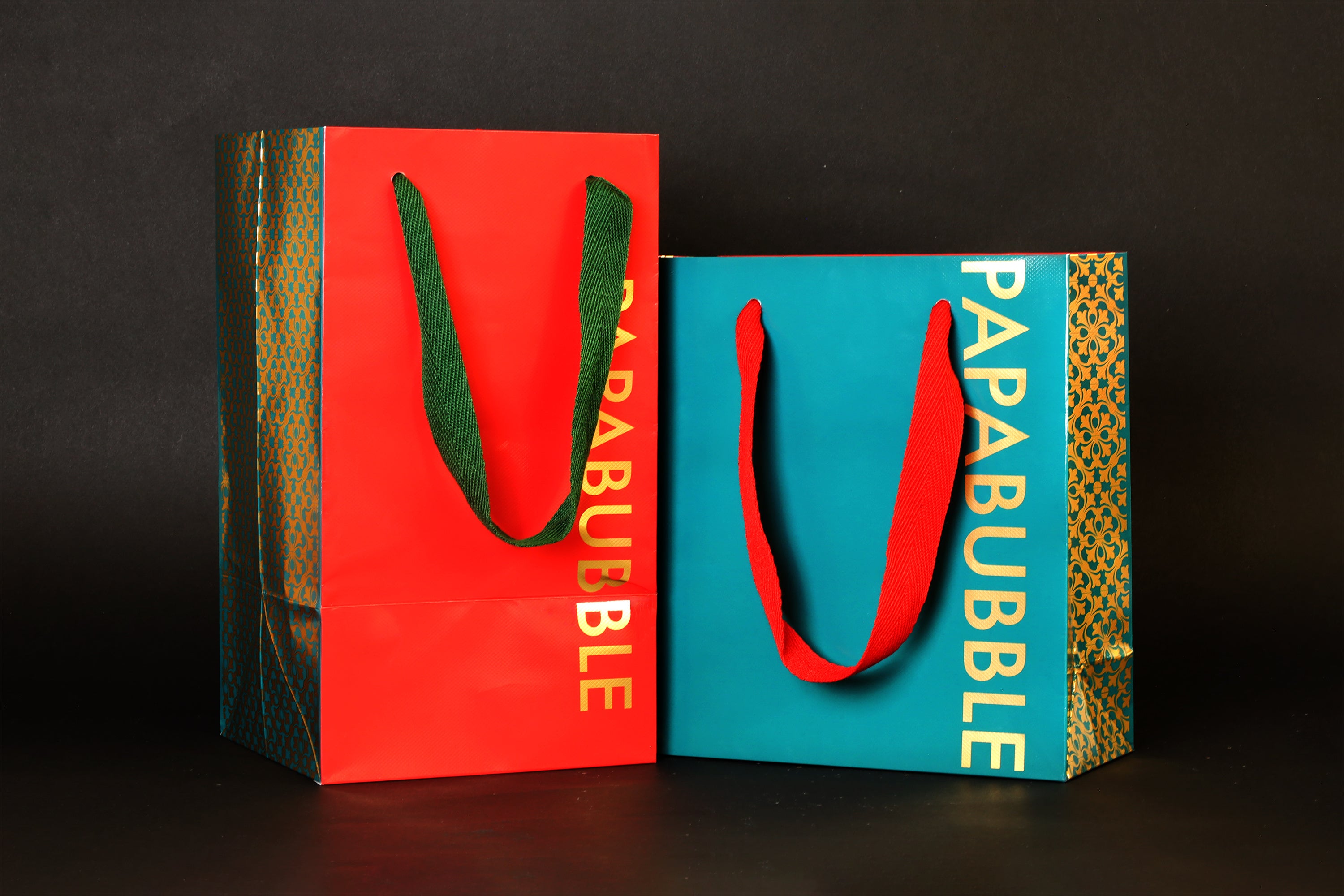 赤と緑のカラーを基調に、表と裏で異なる色合いをデザイン。側面にはスペインタイル柄を金箔であしらい、クリスマスの華やかな雰囲気に映える仕上がりです。