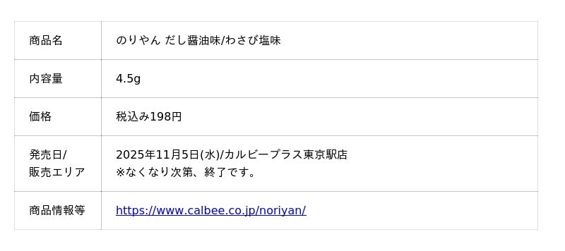 カルビー株式会社(本社:東京都千代田区、代表取締役社長兼CEO:江原 信)は、ポテトチップスなどの商品製造時に出た、原料じゃがいものでんぷんをアップサイクルした代替のり『のりやん だし醤油味/わさび塩味』を2025年11月5日(水)からカルビーアンテナショップ「カルビープラス東京駅店」で数量限定発売します(なくなり次第、終了)。
