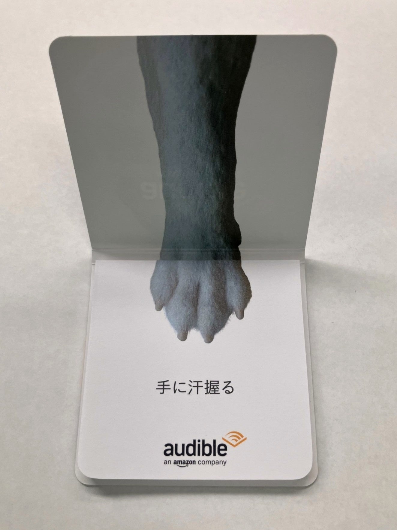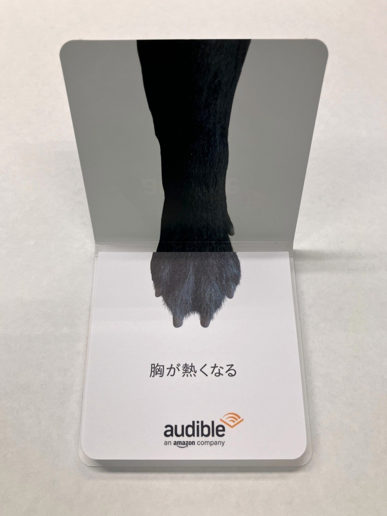 「エキナカAudible体験」に参加いただいた方には、Audibleのテレビコマーシャルでおなじみの"オーディブル犬"の手の写真をあしらったオリジナル付箋をプレゼントいたします。Audibleの「オーディ"ブル"」という名前にちなんで、ブルドッグが愛らしい表情で登場し、多くの方々からご好評をいただいております。